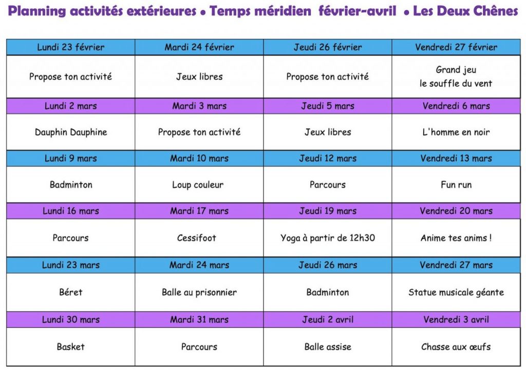 Planning d’activités du temps méridien 2025-2026