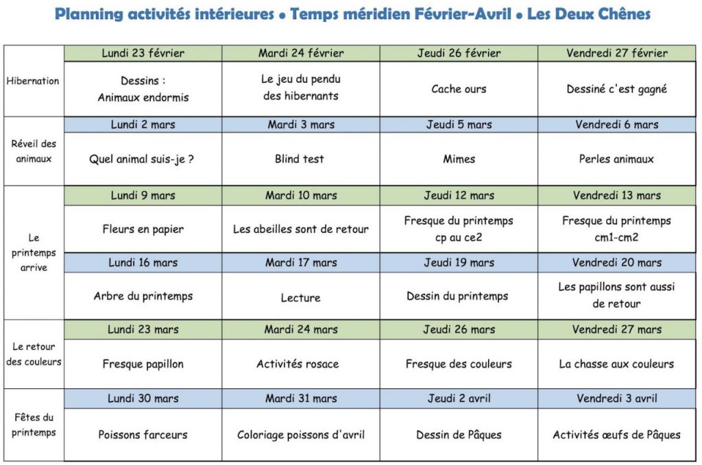 Entre 11h30 et 13h20, les animateurs proposent et encadrent différentes activités en intérieur et en extérieur qui seront affichées ci-dessous au cours de l’année.